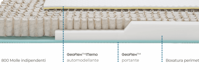 La struttura di Helios è composta da 800 Micromolle indipendenti (versione matrimoniale) che offrono un sostegno preciso ed un’ottima risposta elastica.